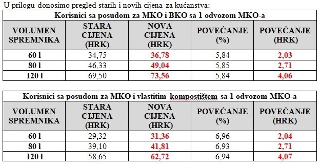 Obavještavamo Vas kako od 01.09.2019. godine dolazi do promjene cijena javne usluge sakupljanja otpada. Nažalost, zbog rasta troškova odlaganja za preko 40%, rasta troška obrade i zbrinjavanja plastike preko 65%, pada prihod od prodaje papira za preko 30%, također rastu troškovi goriva, servisa vozila, zaštite na radu odnosno svi ulazni troškovi, uz to cijena rada u stalnom je porastu. Poskupljenje za kućanstva iznosi između 5,5 – 7% odnosno cca 2,00 – 4,00 kn uz jednu primopredaju MKO mjesečno, ovisno o volumenu ugovorenih spremnika (izvadak iz novog cjenika).
